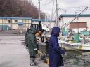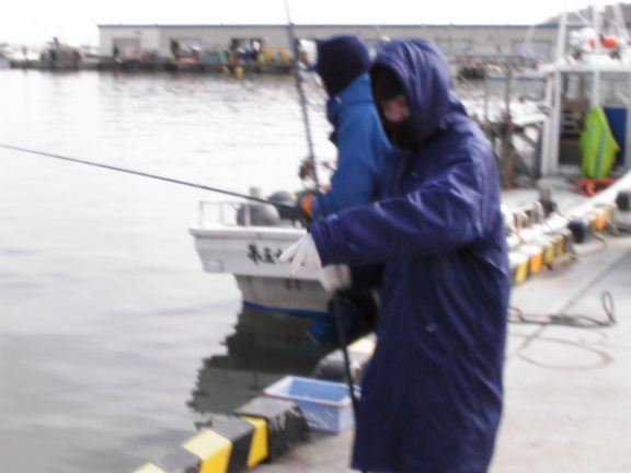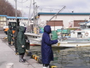 それではまたあとで、と言い漁港に向かった。歩いてすぐ、1分もかからない所にその漁港はあった。すぐ裏と言ってもいいほどの距離である。タイ人が働いている加工場はそこから100メートルくらいあるだろうか。家から仕事場への距離としては申し分ないほど近い。漁港には船が何隻か停泊しており、防波堤には同じようなブルーの合羽のようなものを着た何人かが釣り糸をたれていた。「何が釣れるんですか?」とたずねると、ブルーの人たちがみんなこちらを振り向いた。