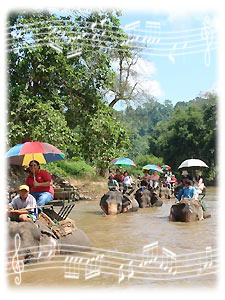 中、象の背中に乗って、鳥のさえずり、動物の声、美しい花々を