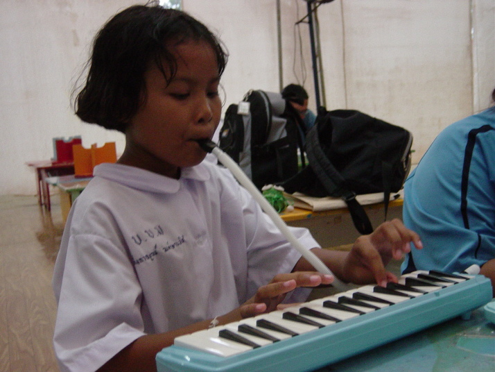 B 市内小学校の卒業生からメロディオンを寄贈してもらった。3箇所のキャンプに配った。一緒に練習した。