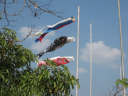 今日は朝会で、雛まつりと鯉のぼりの話をしました。紙の兜をかぶったり、それぞれの歌の終わりのところを歌ったりして、2月24日25日に亘って1年3組の仏教修行がありました。昨年洪水の頃に3年生が3日間の日程で40キロ離れたお寺にこもったのとは違って地元のお寺でしたが、お寺というような建物もなく三方吹き抜けの本堂がある粗末なお寺でした。ところが敷地は広く瞑想の道があったり、大きな台所や修行のためにこもる小屋が 数多くあるなどして、相当な格式を持つお寺だと感じました。 そこに多くの村内の住民が集まり、それに混じって日中だけ参加の小学生と、中学生が、大人と同じようにお経を唱え瞑想の道を歩き、翌朝は托鉢もしました。 仏教の慣わしどおり、午後は食事もなく「おなかがすいた」とこぼす生徒もいましたが、多くは達観(観念か?)したかのように 飲み物を飲んだりして(飲は許される)過ごしていました。 夜は前述の本堂に蚊帳をつって女生徒が、男子生徒は、林の中に蚊帳をつったりテントを張ったりして寝ました。 聞くところによると2時ごろにはもう起きはじめ、5時のお勤めが始まるまで静かにさせるのに苦労したということです。 驚いたことは、がきのご本尊みたいな男子生徒が、全体の読経のリード役を務めたり、大人と同じ正式の白装束で参加して、礼法はもとよりお経も全部覚えているという女生徒がいるということでした。 何より、お坊さんの一声でこうも従順になれる生徒を見て、タイの国を支えている仏教の底力と怖さを感じました。 早朝の托鉢でいただいた食べ物をみんなで分け合って(たくさんありましたが)食べて、修行は終わりました。 みなさんの利用したペットボトルは利用価値があるとかで、全部学校へ持ち帰りました。(掃除をしてるんじゃなかった?) ヤイッ !! 普段の授業のときもこうやれえ・・・ 翌日、がきん子はやっぱりがきん子に戻っていました。 トップへ Vol5 髪が長い乱れていると、先生がバッサバッサと髪を切り落としています 最終日の2年生の授業は折り紙にしました。3日の朝会で、雛祭りと鯉のぼりの紹介をしたばかりだったので、お雛さまと兜を作りました。 ここで、『折る』とか『半分』とかいう日本語を教えるつもりでしたが、わたしの手元を見ながら「パップ」とか「クン」とか言いながら折り進みます。なんだかこちらがタイ語を習っているような雰囲気でした。いつもはいたずらで(にくい)彼らの素直に喜ぶ笑顔がとても素敵でした。 成果はどうかと聞かれると答えに困ります。ただ、村の人に「おはようございます」と挨拶すると、誰彼なく頷いて笑顔で応えてくれます。生徒たちはどこで出会っても「おはようございます・おげんきですか・こんにちは(わ)」「さようなら」と声を掛けてくれます。近くの幼児も「さよなら」と手を振ってくれます。日本語は難しいとタイ人は言います。(わたしはタイ語が難しい・・) しかし、タイ語であろうが日本語であろうが、違和感無く挨拶がし合えるということも大事なんだろうなあと、近頃つくづく思います。小さな村の学校だからそれが出来たと、ここに来た意味を考えているところです。 髪が長い乱れていると、先生がバッサバッサと髪を切り落としています。制服についた毛は仲間が払い落とし、そばにいる生徒が落ちた髪を掃き集めています。わたしを見て「先生も切りますか」なんてふざける生徒もいて周囲を笑わせます。誠にさばさばした光景です。日本のお母さんが見たら卒倒しそうな・・・この情景もタイ・・・ 校長先生に喫煙の現場を抑えられた2年生6人は、昼食後の休み時間、校長室前に来て自由を拘束??されることになりました。教頭先生の計らいで工作をさせたら結構よくやるのです。見込みがあるかなあと期待しながら教えていましたが、謹慎が解けたら全く顔を見せません。 ・・・タイ人は飽きっぽい・・・といううわさは本当かも知れない。 トップへ Vol4: 鯉のぼりを見て「おいしい」という男子生徒も・・・うん!!魚は食べ物なんだ・・・ 日本の子どもたちが両親にどんな期待をされ、どのように育てられているのか、分かりやすく話したつもりです。 通訳の先生と事前に簡単に打ち合わせもしましたが、相当に内容が濃くなって伝わっていたようです。時々生徒が笑うのですが、 なぜ笑っているのかさっぱり分かりませんでした。 雛人形については、インターネットで写真を取り出し、プリントして各クラスに1枚づつ配りました。値段の高いのにびっくりしていました。 あしたは、2年生に紙雛の作り方を教えます。『折る』とか『半分』『おもて』『ひらく』などの言葉を教えます。 6日ですべてのテストが終わります。成績のよかった生徒は11日から休みに入り、基準に達しなかった生徒は補修することになります。 26日に査定の結果が通告され、進級するものと残るものが振り分けられます。残留したものついては10月のテストで救済されるとい