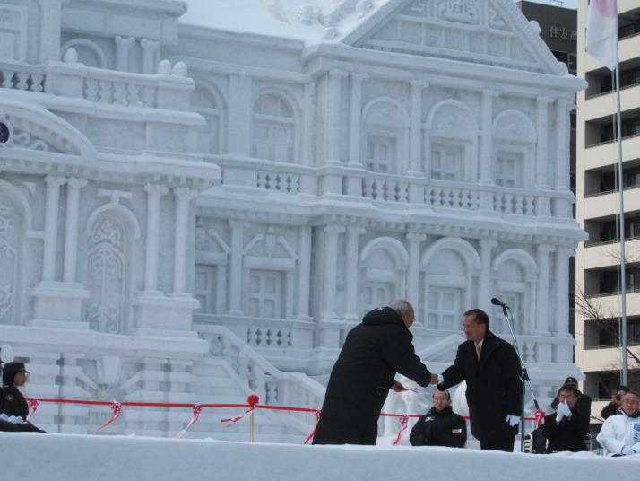 駐日タイ大使は「諸外国の友好を築く場所として歴史的、芸術的に重要であるだけでなくタイ国民の心のよりどころであるチャックリー・マハー・プラサート宮殿が、今年で日タイ修好120周年の記念すべき年にさっぽろ雪まつりで雪像としてつくられることでタイと日本の関係をより深める大きな機会となりました。今日こうして雪で作られた宮殿を見てとても美しく感激いたしました、作成された自衛隊の方々とご協力された方々に大変感謝しています。」などと話されていました。上田文雄札幌市長は「まっしろに輝き、気品あふれるこのチャックリー・マハー・プラサート宮殿を見て大変感動しています。タイと日本の修好120周年の記念の一環として作られたのですが、これを機にさらに両国の友好が深まるようにとりわけこの雪が降る美しい札幌とタイの皆さんの友情が芽生えることを願っています」と話されていました。また上田市長によるとこの式典がインターネットを通じてタイの皆さんに放送されているということで「ぜひ皆さん、この札幌に遊びに来てください。心から歓迎しています」と呼びかけていらっしゃいました。