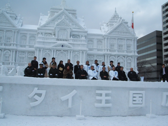 式には駐日タイ大使やタイ国政府関係者、札幌市長、北海道放送社長、さっぽろ雪まつり実行委員会会長が出席し、陸上自衛隊から雪像を引き渡されました。式の前後には自衛隊の音楽隊による演奏でタイの国歌や「好きですサッポロ」などの音楽がながれ、完成したチャックリー・マハー・プラサート宮殿の左右にタイと日本の国旗も掲揚されました。